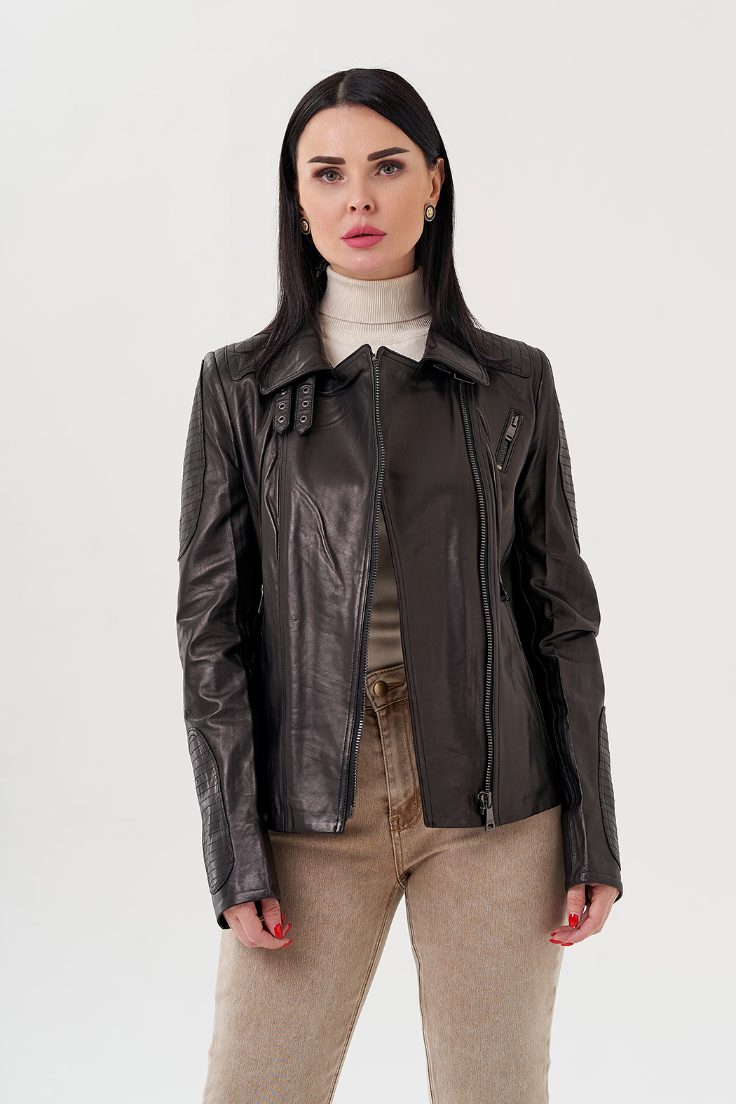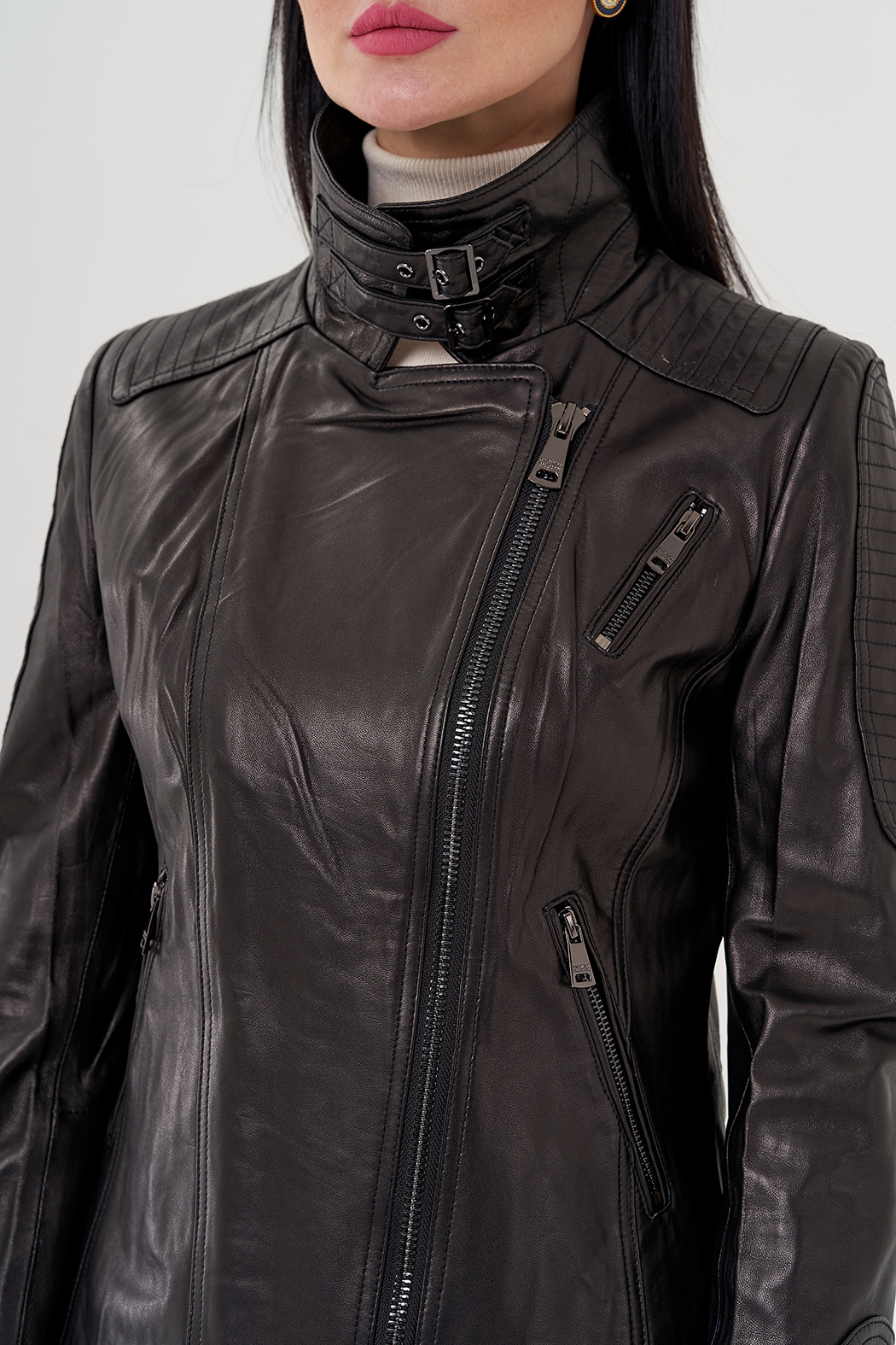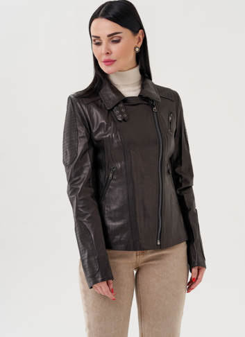 Куртка из натуральной кожи - изящная и универсальная вещь в гардеробе. Выполнена в черном цвете, что делает ее практичной. Модель приталенная, что делает ее более женственной. Застегивается на молнию. Воротник можно поднять и закрепить на ремешки. По бокам есть карманы на молнии. Куртка стилизована накладными вставкамина рукавах и плечах.